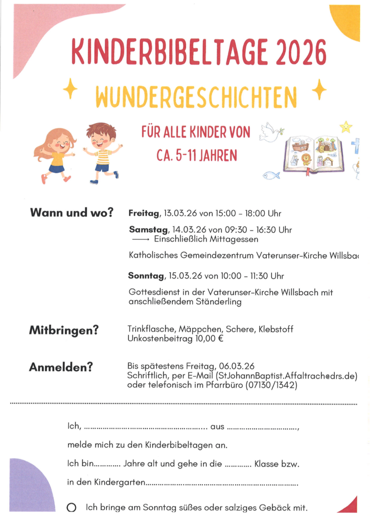Alle Kinder zwischen ca. 5 – 11 Jahren sind herzlich zu unseren Kinderbibeltagen ins Gemeindezentrum Willsbach am 13.03.26 von 15 – 18 Uhr, am 14.03.26 von 9.30 – 16.30 Uhr und am 15.03.26 um 10 Uhr zum Abschlussgottesdienst eingeladen.